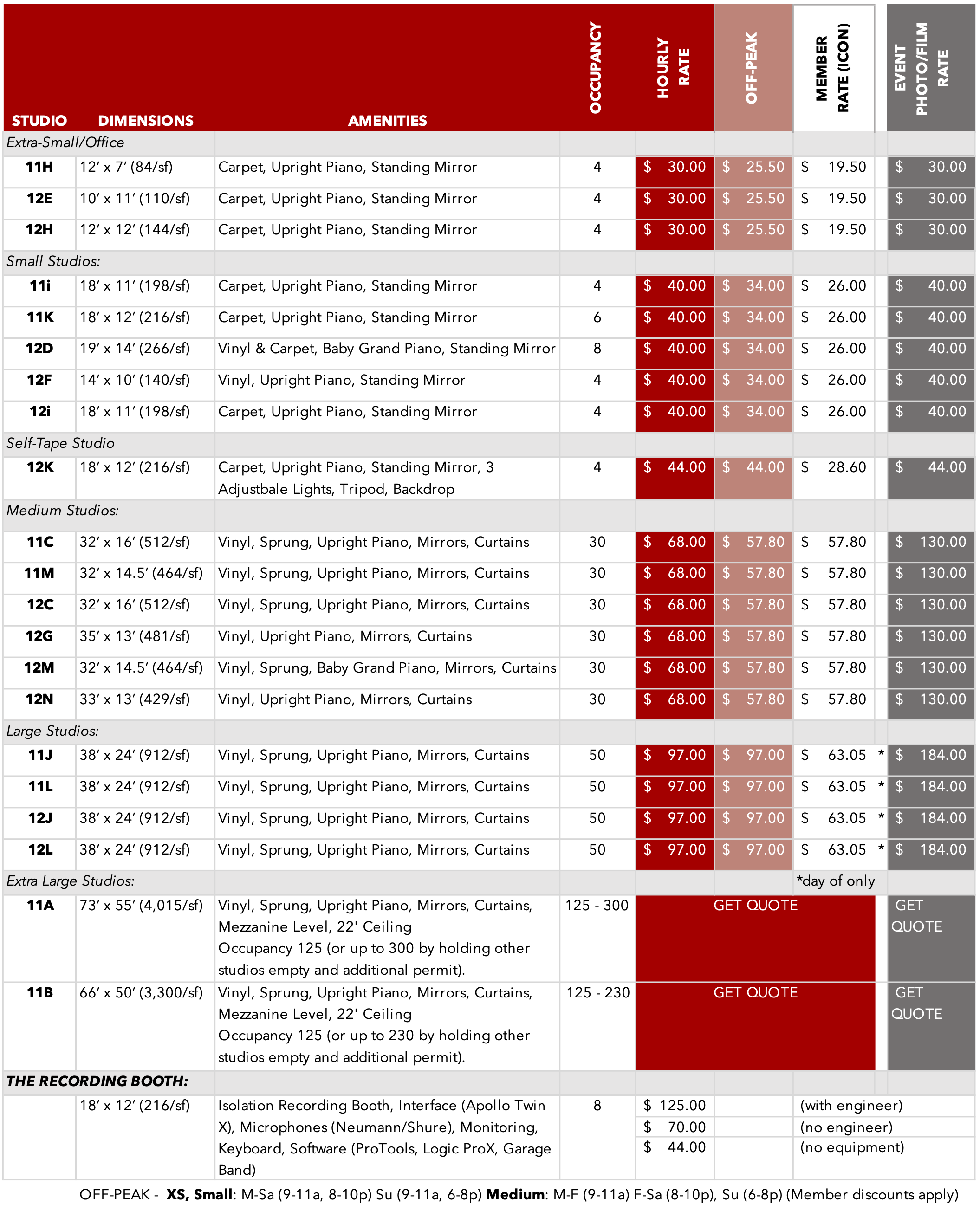 STUDIO 12i: W: 18’ D: 11’: Ht.: 10’-9” (piano)